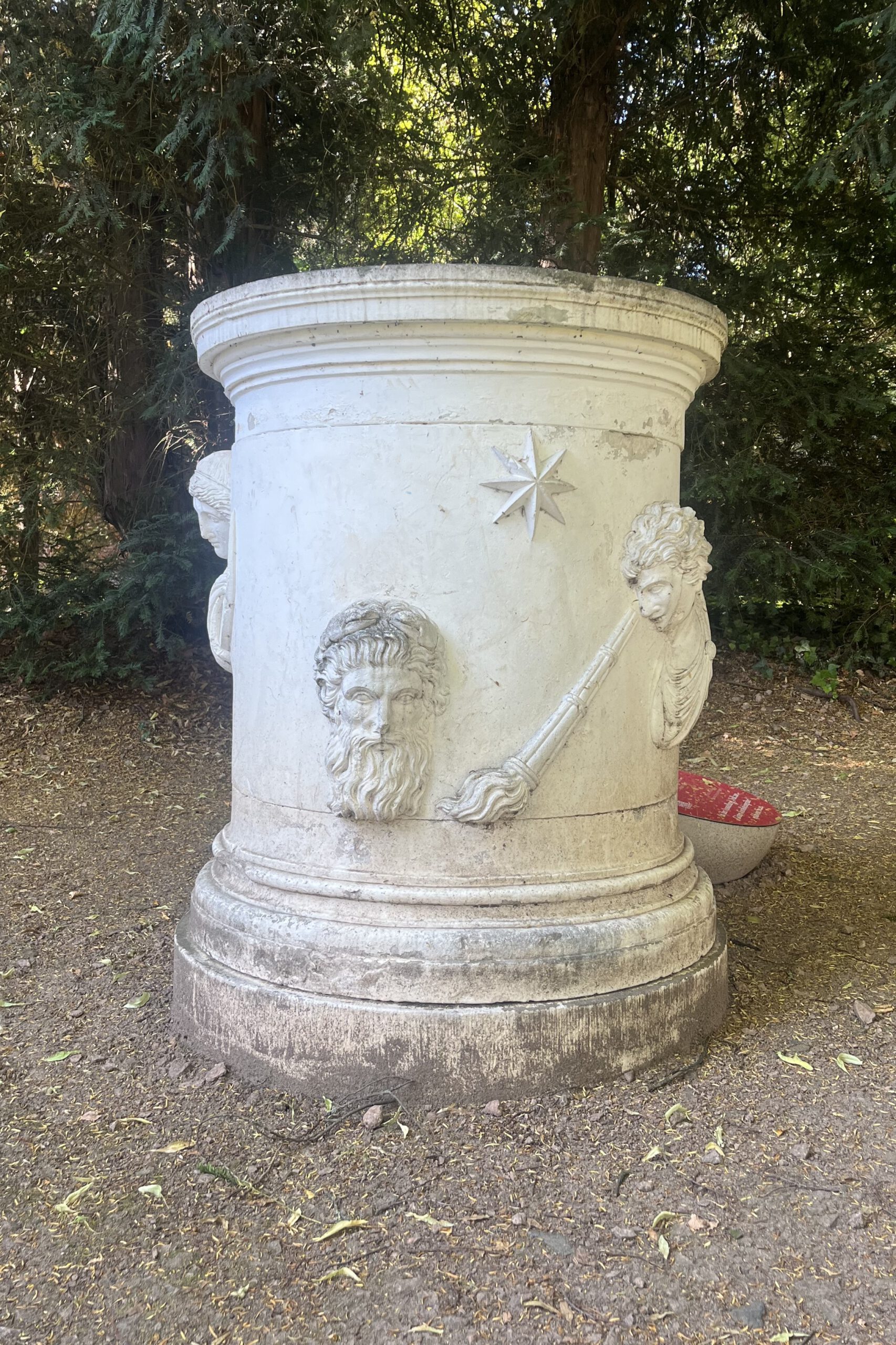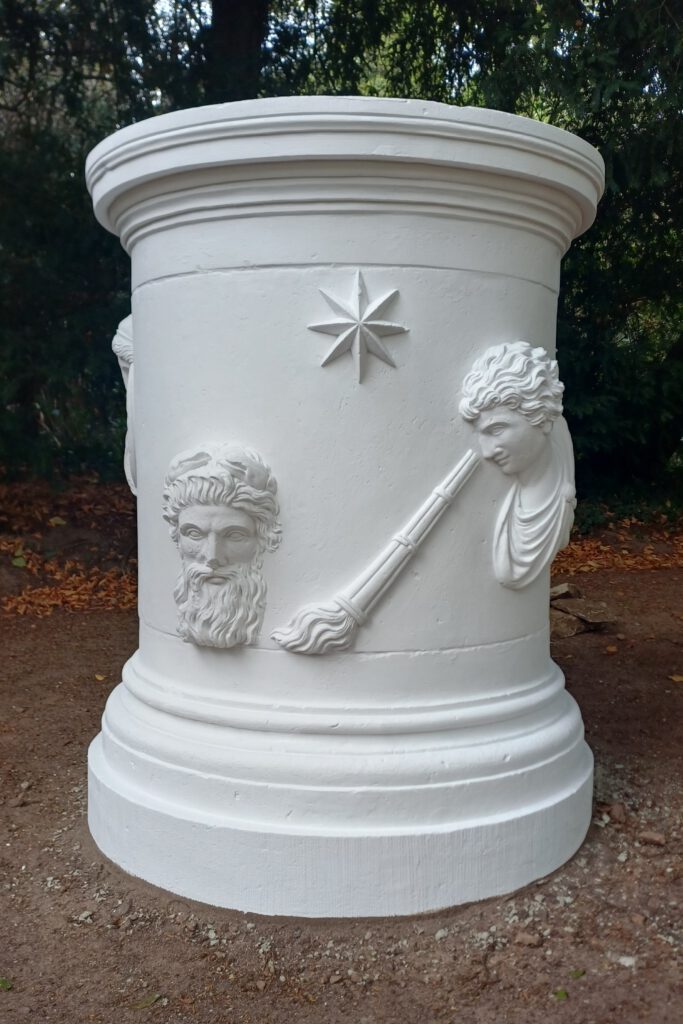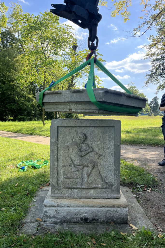 Den Ara, die Dietrichsurne und den Dornenauszieher haben wir von biogenen Belag und Verschmutzungen gesäubert. Im Anschluss entfernten wir die beschädigte Farbe mit chemischen Mitteln, ergänzenten Fehlstellen und schlossen die Fugen.
